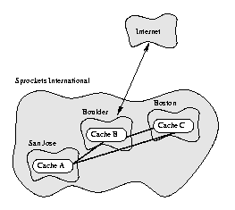 In this example, the caching administrator controls caches distributed across several different work sites. A cache exists at each of these sites and a single connection to the Internet is provided. The bandwidth to the Internet is limited, and the bandwidth between the cache locations is plentiful. This scenario is shown in Figure 2, where Sprockets International has offices in San Jose, Boulder, and Boston, with a single connection to the Internet. As a result of the limited bandwidth to the Internet, the cache administrator would like to favor removal policies that evict objects that are cached in multiple locations, thus maximizing the total number of objects cached.