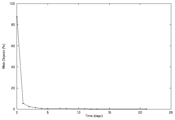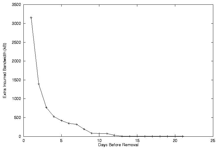 In this experiment we explore the benefits of using information based on the server's web content for customizing caching policies. The idea in this experiment is to consider a web newspaper that adds new articles each day. We use NLANR logs from December 21, 1998-February 2, 1999 to investigate the unique behavior of news articles and images from the ABCNews web site4. The files in our trace represent 29 MB of requested objects. In Figure 7, we plot the time over which a document continues to be requested. We notice that 87% of the web objects are not accessed after 24 hours from the initial request. Therefore, by taking advantage of the object semantics to remove objects early, we can make room for other objects in the cache. To evaluate the benefits, we apply a specialized removal policy that purges documents from the cache after a given number of days have passed. Figure 8 shows the additional bandwidth required to access files that were removed early. If documents are purged after 1-2 days, there will be .5-1.5 MB of documents that will be requested that were previously cached. Most of this bandwidth comes from a few files. A smarter policy would allow exceptions to the one-day purge rule for these few files. We conclude that using the document semantics can provide a benefit in decreased cache utilization by files that won't be accessed again and a slight decrease in hit rate for a few popular pages.