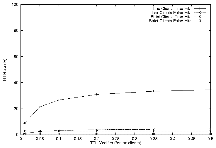 We perform two experiments that look at the effects of different clients selecting a different factor in the TTL calculation of document freshness. The first experiment explores the benefit of allowing clients to specify different factors in the TTL calculation. In this experiment, we subdivide the clients into two groups: strict clients and lax clients. The strict clients have minimal tolerance for web objects that have changed. As a result they utilize a small constant (k = 0.001) in the TTL calculation. However, this small constant penalizes the lax clients that can tolerate some old information. In Figure 4, we show the results of the experiment, varying the TTL constant for the lax clients. The graph plots the true/false hit rates achieved by the clients. The strict clients have a low true hit rate because they require many IMS requests to verify coherency, or false misses. As a tradeoff however, they minimize the number of false hits to about 0.3%. In contrast, the lax clients achieve hit rates 10 times the level of the strict clients at the cost of a higher false hit rate of 4.5%. This experiment demonstrates that it is desirable to allow clients to specify their desired level of coherency.