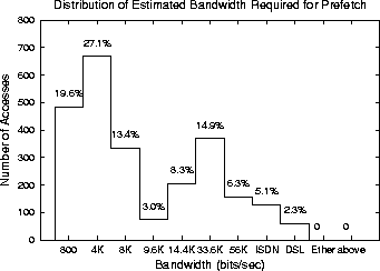 Figure 3 is the distribution of ``total page size'' divided by inter-reference time. That is, references in the log were analyzed to determine the size of an HTML page plus all its embedded images, whether or not they were actually referenced -- an overestimate of what is needed to completely prefetch a page. Then this number was divided by the time between when that page's referrer was loaded and when the page was requested. This quotient is the maximum amount of data a prefetcher would have to deliver divided by the amount of time available to it: the bandwidth needed to prefetch one page. The median bandwidth is around 5KB/sec, safely within the capacity of even a dialup modem, suggesting that several pages could be prefetched while remaining within bandwidth constraints.