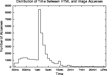 The results are broken down into two categories: HTML referencing HTML (Figure 1), and HTML content referencing image content (Figure 1). The breakdown is intended to capture the difference between references to embedded hyperlinks and images, respectively. As shown, the browser-generated references to embedded images happen much more quickly than user-generated references to hyperlinks. The median inter-reference time between two HTML pages is 52 seconds, while inter-reference time between an HTML page and an image page is 2.25 seconds. However, a significant fraction of images (32.3%) are requested within one second or less of the referencing HTML page. This suggests that when an HTML page is prefetched, its embedded images should be prefetched too. Doing so substantially increases the penalty for being wrong.