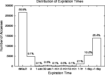 As Figure 4 shows, the most common expiration time is zero (60.0%). Typically (50.9%), zero is determined by default because the server has provided no information (Expires or Last-modified headers) upon which to base an estimate. The rest of the time (9.1%), the server has provided identical Expires and Date headers.