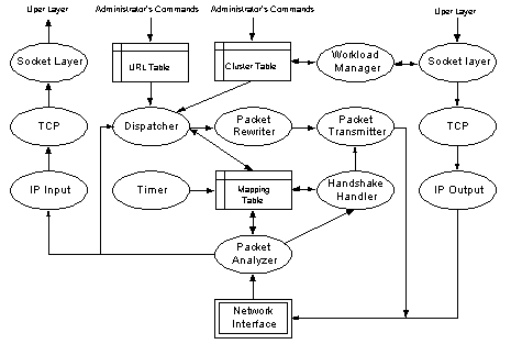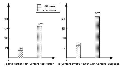 We have designed and implemented an algorithm to map the sequence number, ACK number, and TCP options from the user connection to the pre-forked connection. We find the idea behind the algorithm is similar to the TCP-splicing technique proposed by [37]. For the sake of brevity and space limitations, we omitted the description of this algorithm. The reader can see [37] for further information. In addition, changing these headers requires that the IP checksum and the TCP checksums be updated. Re-computing the entire checksum is expensive [38]. We implemented a method (described in [39]) to incrementally update the checksum. 4.3 Connection Management The rationale of pre-forking long-lived connections (described in section 3.2) is to reduce overhead and latency of establishing a second connection. However, an idle open TCP connection incurs a system-resource cost (e.g., socket, buffer space, and PCB entry [40]). Thus, we designed and implemented a connection-management mechanism in the workload manager to strike a good balance between the benefits and costs of maintaining open connections. The connection-management module uses two parameters to control the number of pre-forked persistent connections: maximum number of connections (MAX for short) and minimum number of connections (MIN for short). MAX defines the threshold between system trashing and maximum optimization of system resources. The workload manager periodically queries each server node for its current load to determine the value of MAX. The connection management mechanism keeps a fixed limit (MIN) on the number of available persistent connections. When the total connections (used and unused) reach MAX, it stops pre-forking connections. To date we use a trivial fixed length timeout policy for closing idle connections. An adaptive timeout mechanism may be more appropriate in some cases. This is an area of further research and beyond the scope of this paper. 4.4 Dispatcher The dispatcher is responsible for making routing decisions based on content-aware intelligence. Up to now, we have implemented the following content-aware intelligence: lAffinity-Based Routing A request routing function can reduce retrieval latency not just by balancing loads and maintaining low overhead but also through a third mechanism: affinity-based routing. An important factor to consider is that the latency for the server to serve a request from the disk is far longer than the latency to serve the request from the memory cache. With the content-aware mechanism, it is possible to direct requests for a given item of content to the same server so that the server can respond more quickly, due to an improved hit rate in the memory cache. In other words, requests are always dispatched to servers that already have data cached in main memory. Due to significant locality presented in user's references [41], the overall performance can benefit quite strongly from such a design. However, naively affinity-based routing achieves higher cache hit rates at the possible expense of load balancing. A number of algorithms have been proposed to overcome this problem. Examples include [42, 43]; our implementation is based on [42]. lDispersing Content Placement The content-aware mechanism enables a new content placement scheme, which allows the administrator to partition the content by hosting portions on different servers. The content partition may be governed by type (e.g., static HTML pages, CGI scripts, multimedia files, etc.) or by some other policy (e.g., priority). We implement some administration functions for administrator to configure the URL table to deploy the content tree. The new content-placement scheme offers several advantages over the traditional schemes. First, compared to full replication, this scheme yields better resource utilization and scalability while also avoiding the overheads associated with NFS approach. According to the traffic characterization of a modern Web site [44], large files (up to 64 KB) make up only 0.3% of the content but consume 53.9% of the required storage space. In addition, these large files receive only 0.1% of all client requests. Thus, full replication of these files is not cost-effective. We can just place these files on some nodes in the cluster. Second, we can place different content on different server optimized to address the requirements imposed by various data types. For example, we can place multimedia content on a server optimized for stringent real-time requirements. Finally, it provides the Web site manager with greater flexibility in selecting the optimum cost/performance configuration for their Web server. This is an important feature for cluster-based servers. Cluster-based servers tend to be heterogeneous because they generally grow incrementally as needed. In such a heterogeneous environment, some nodes may not be powerful enough to support an entire service, but can probably support some components of the service. The content-aware mechanism enables the administrator to place different content on different nodes according to their capability, which can maximize server investment returns. lContent Segregation From our previous experiences, we noticed that resource-intensive dynamic content processing (e.g. a complex database query) has the tendency to slow down the requests for static content, resulting in longer response times for these short requests. As a result, we suggest that the dynamic content should be segregated from the static content on different nodes. Another reason supporting the idea of content segregation is that the dynamic content is generally non-cacheable, so the affinity-based routing strategy is not directly applicable to it. We implemented a Weighted Least Connections algorithm to dispatch the requests for dynamic content. For requests to static content, the dispatcher performs routing decision with the affinity-based routing mechanism. 4.5 Future Directions Because the function of the dis