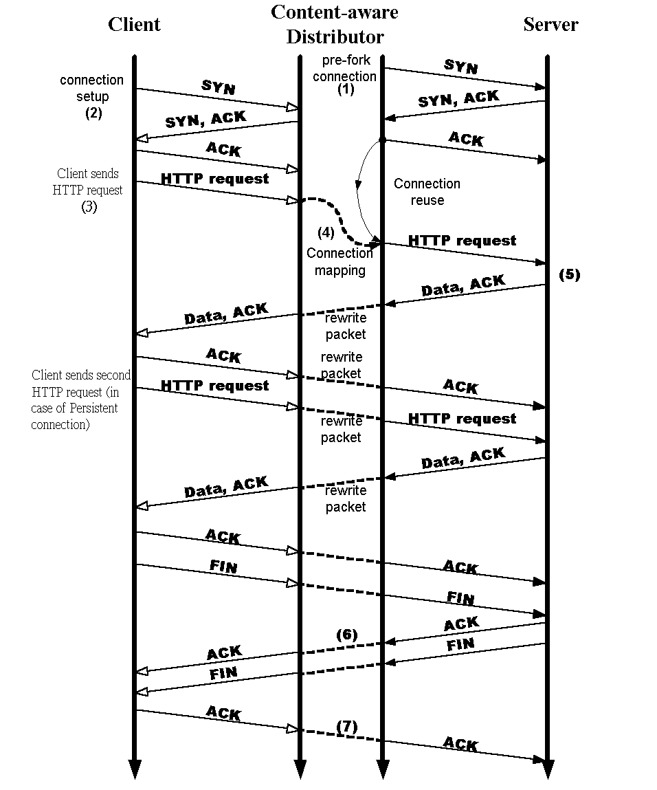 3.1 Connection Setup Whenever a client tries to initiate an HTTP request (position 2 in figure 2), the client-side browser first opens a TCP connection, resulting in an exchange of SYN packets as part of TCPˇ¦s three-way handshake procedure [30]. For each incoming packet, the packet analyzer inspects the information embedded in the IP and TCP header. If this packet is not destined for the Web service, the packet is passed up to the normal protocol stack. Otherwise, the mapping table is consulted to find the corresponding mapping information. If no information about this packet is found, the packet analyzer checks the SYN flag in the TCP header. If the SYN flag is set, representing the arrival of a new TCP connection, the handshake-handler module is invoked. The handshake-handler module first creates an entry in the mapping table for this connection and sets the status of this entry to SYN_RCVD. Then it handshakes with the client to complete the TCP connection setup. When connection establishment is completed, the status is changed to ESTABLISHED and the TCP state information (e.g., sequence number, ACK number, etc) is recorded in the mapping-table entry. 3.2 Transmitting the HTTP Request After the TCP connection setup is completed, the client sends packets conveying the HTTP request for the specific content it is looking for. Once such a packet arrives, if the packet analyzer can find a corresponding entry in the mapping table and the status of this entry is ESTABLISHED, then the dispatcher module is invoked. The dispatcher parses the URL of this request, and then looks up the URL table and cluster table to select the server that possesses the requested content and is least loaded. The cluster table is maintained by the workload manager which performs the following three functions. First, it estimates the current load on each server node to help the dispatcher make the optimal decision. Second, it monitors the health of the server nodes to bring them transparently in and out of service. Third, it pre-forks (i.e. creates a socket and establishes a TCP connection) a number of TCP connections to each server (position 1 in figure 2). These pre-forked connections are kept long-lived. Once the dispatcher selects a target server, it also chooses an idle pre-forked connection from the available connection list. Then the dispatcher stores related information about the selected connection in the mapping table and changes the state to ACTIVE, which will bind the user connection to the pre-forked connection (position 4 in figure 2). The first objective behind such a design is to avoid the overhead of initiating a new connection to the selected server every time an HTTP request is made. Otherwise, it can increase user perceived performance by avoiding multiple slow-starts [31], because multiple successive requests conveyed by different user connections will be served by the same long-lived connection. We will demonstrate the advantages of this approach in section 5. After the connection binding is determined, the packet-rewriter function is invoked to change the packetˇ¦s IP and TCP headers for relaying the packet from the user connection to the pre-forked connection. After the packetˇ¦s header is modified, the packet transmitter function is invoked for directing the packet to the selected node. The packet transmitter will find the network interface on which this packet should be forwarded. Then it constructs a network frame for transmission to the indicated interface. The forwarded frame has the MAC address of the network interface of the selected server. 3.3 Subsequent Data When the designated server receives the request, it parses the URL to determine the content requested. It then fulfills the request and transmits the response to the client. The distributor also intercepts these response packets and performs the reverse packet modification so that the client can transparently receive and recognize these packets. The distributor also handles the persistent connections suggested by HTTP 1.1 [22]. HTTP 1.1ˇ¦s persistent connections use one TCP connection to carry multiple HTTP requests, thereby reducing server load and client perceived latency [32]. Our mechanism inherently supports persistent connections. For HTTP 1.0 requests (non-persistent connections), the distributor can reuse the pre-forked connection to carry these requests, which will avoid extra TCP 3-way handshakes and multiple slow-starts. Otherwise, the distributor splits multiple HTTP 1.1 requests within a persistent connection into single requests. If these requests belong to the same session, the dispatcher routes them to the server assigned to the same session. Else, it schedules the individual HTTP 1.1 requests to different servers based on content of these requests. 3.4 Connection Termination If the packet analyzer receives a FIN packet, which indicates that one host participating in this TCP connection intends to close this session, the state of corresponding entry in the mapping table will be changed to FIN_RECEIVED. Later, when the peer responds with an ACK packet to the FIN packet (position 6 in figure 2), the state is changed to HALF_CLOSED. When both FIN and ACK from two participating hosts in this TCP session arrive (position 7 in figure 2), the state is changed to CLOSED, and then the entry associated with this connection will be deleted after 2MSL (Maximum Segment lifetime, which is used to handle wandering packets in the Internet [30]). If the client fails or loses connectivity with its server, there may be no FIN or ACK to arrive as anticipated above. This will result in accumulation of stale entries in the mapping table. To solve this problem, we maintain a timestamp for each TCP connection in the mapping table, which will timestamp the connection records each time a packet flows through them. The timer function periodically checks and deletes expired entries, defined as those that have been idle for a configu