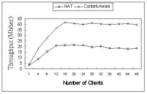 We conduct another experiment to confirm that our design can effectively reduce the overhead. We first disable the pre-forking mechanism. That is, once the routing decision has been made, then the distributor creates a second TCP connection to the selected server. When the second connection has been setup, the distributor then starts to relay packets to the selected node. Under such a situation, the overhead increased by 89 m secs. More importantly, such a change obliges the distributor to allocate memory buffer to queue the pending packets, increasing the burden of the distributor. 5.2 Benefits of the Proposed System To demonstrate the benefits of the affinity-based routing mechanism, we first conducted experiments in the following environments: (1) 6 server nodes clustered by the content-aware distributor; (2) 6 server nodes clustered by the NAT (Network Address Translator [11,12]) router. The NAT router is the implementation in our previous work [4]. In the NAT router, we implemented a ˇ§Weighted Round-Robinˇ¨ mechanism for load distribution, which is content-blind. We used the WebBench benchmark with its standard static test suites to generate the client workload in these experiments. This standard static test suites define the workload WebBench uses to simulate traffic at actual Web sites. The workload is representative because it was created by examining log files supplied by many real Web sites, such as ZDNet, the Internet Movie Database, Microsoft, and USA Today [45]. Figure 3 shows the results in terms of throughput. It clearly shows that the server cluster with the content-aware distributor consistently achieved a greater throughput than the NAT cluster. The result also indicates that the additional overhead introduced by content-aware distributor can be compensated by sophisticated content intelligence. ![]() Figure 3. Benefit of Proposed System (Throughput) We conducted another experiment to quantify the performance benefits of content-aware routing incorporated with content segregation. We used WebBench with a dynamic test suite (a mix of 20 percent CGI requests and 80 percent static requests) for this evaluation. We measured the performance under the same two environments described above. In the NAT cluster, the content sets are also replicated in each participating node. For the content-aware cluster, we separated dynamic content and static content on different servers. Figure 4 shows the results. The results show that the throughput achieved with content-aware routing outperforms that of Weighted Round-Robin. In the content-aware router with content segregation, the average CGI request and average static request increased by 27 percent and 36 percent respectively. The reason for this higher performance is because the content segregation prevents short Web requests (e.g., request for static content) from being delayed by long running request. ![]() Figure 4. Benefit of Content Segregation (Average request/second) 5.3 Lessons Learned Examining the results of our performance evaluation, it is noteworthy that the overhead increases with document size. This is because our mechanism performs some data-touching operations such as forwarding the packet and computing checksums. In our current implementation, packets from the server to the client must pass back through the distributor, and header modification is performed on each packet. If packets can go directly from servers to the client without having to pass through the distributor, the overhead can be further decreased. This is particularly beneficial while the amount of data sent from the server to the client is significantly larger than the amount of data sent from the client to the server. Thus, we implemented a module that can be loaded into the kernel of the back-end server. The module can change the outgoing packets so that they can go directly to client. However, many Web site builders may not prefer this approach because it requires modification of the back-end serverˇ¦s kernel. In contrast, our previous implementation can be applied to any existing Web site without modification of backend server, but it pays a performance penalty. We suggest that the administrator can use the first approach for those nodes executing kernels that cannot be modified, and apply the second approach to those nodes that we can modify for performance gain. 6. Comparison In this section, we compare our mechanism with the existing methods and related work. We discuss the advantages and disadvantages of various mechanisms. NCSA [10,11] first proposed a clustering technique that uses the DNS-based approach, which has the advantages of low overhead and ease of implementation. The main weakness of this approach is that the name-to-IP-address mapping can be cached by multiple levels within the hierarchy of DNS service [46], bypassing address resolution. Thus, all requests behind a particular name server will be directly sent to the same server node until the cached address expires. This will lead to significant load imbalance, which has been quantified in [48,49], and several researches have attempted to overcome the problem [50,51,52]. However, another problem is that internal changes of the clustered server will propagate slowly through the Internet, due to address caching. That is, if one server node fails or is removed temporally for maintenance, a number of clients may continue trying to access the failed server using the cached address. In contrast, our mechanism is much faster than the domain name service in detecting failures and responding to it. The connection-routing approach [13-20] can achieve fine-grained control in incoming requests compared to the DNS-based approach. However, since all connections to a server cluster have to pass through the front-end, it is a single point of failure and may become a bottleneck at high loads. Additionally, because they do not look into the content of requests, they are incapable of using more
